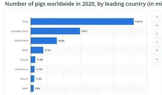 根據(jù)STATISTA數(shù)據(jù)公布統(tǒng)計(jì),截至2020年4月,中國擁有3.1億頭生豬,歐盟有1.48億頭美國有0.78億頭,占據(jù)世界前三位。目前全球生豬總量約為6.67億頭豬,相比2019年同期的7.76億頭下降了約1.1億頭。